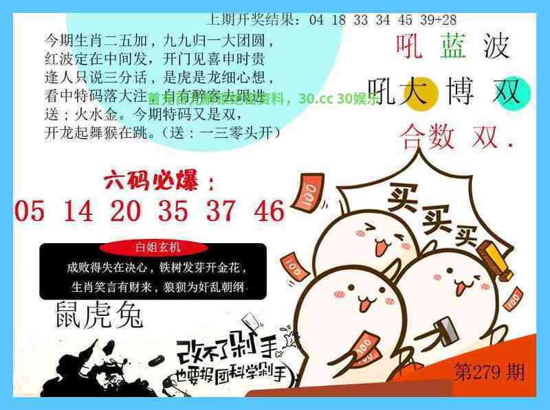 279期:九肖 | 马鼠羊猴龙虎鸡兔猪 | 開:兔27 |